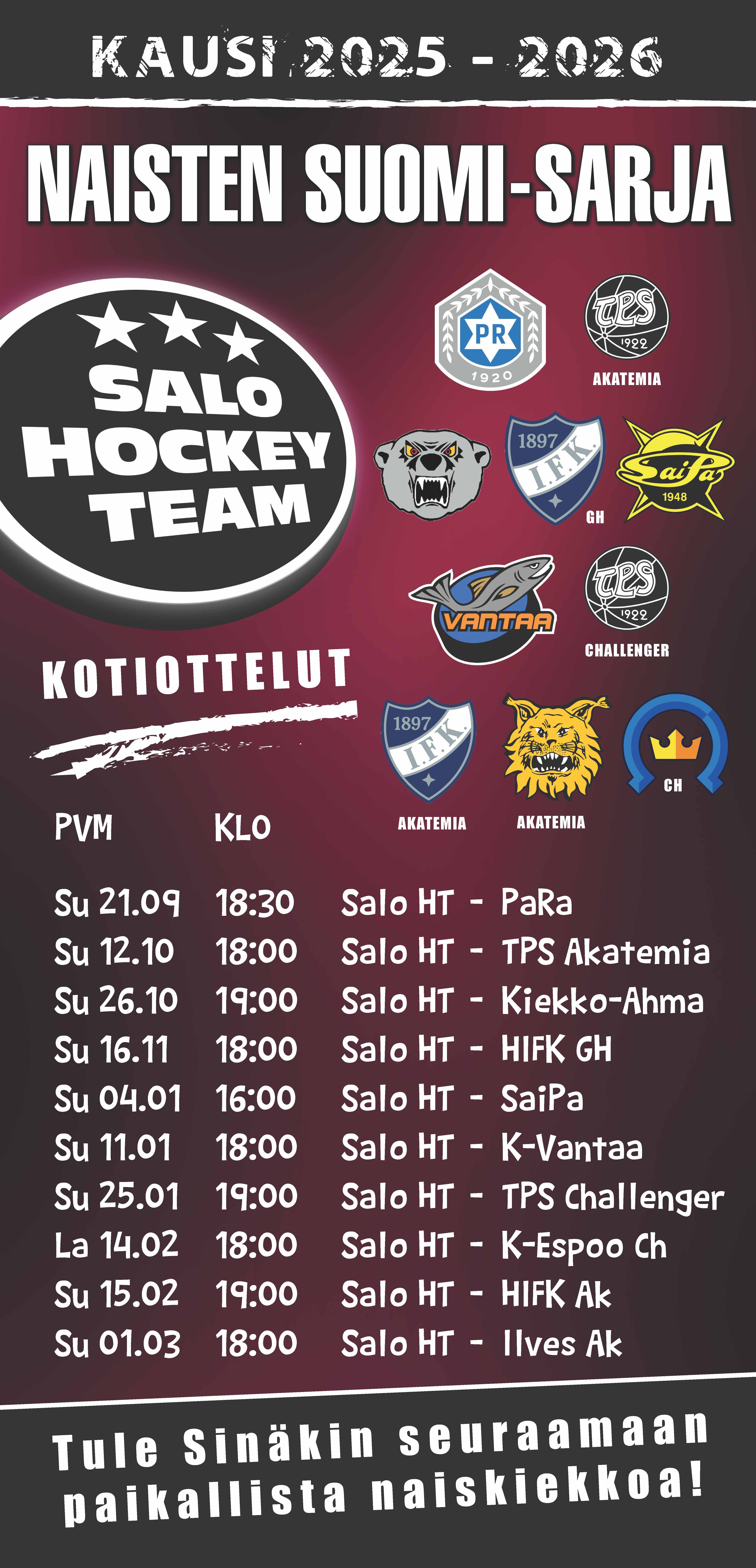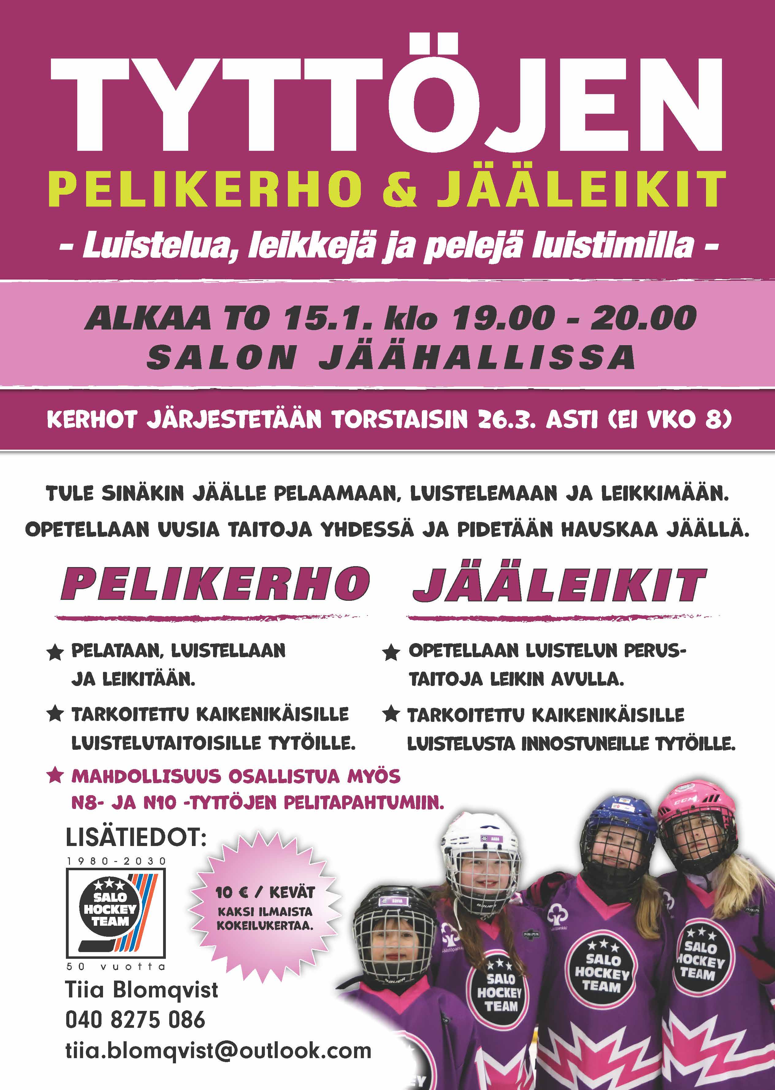 Nyt kaikki tytöt innolla mukaan hauskan harrastuksen pariin. Salo HT:n järjestämät tytöille suunnatut peli- ja jääleikkikerhot jatkuvat torstaina 15.1.2026 klo 19.00 Salon jäähallissa.